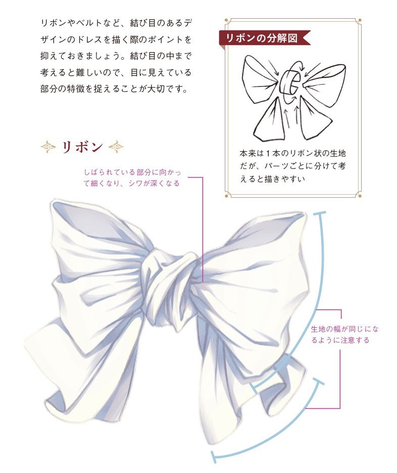 玄光社 超描けるシリーズ V Twitter 超描ネタ帳 細かい表現の難しいリボンですが 見えている部分のパーツを切り分けて考えてると 描きやすいですよ Kyachiさん Shirotumechika 著 ドレスの描き方 より T Co Psktwitj3o 超描ネタ帳 T